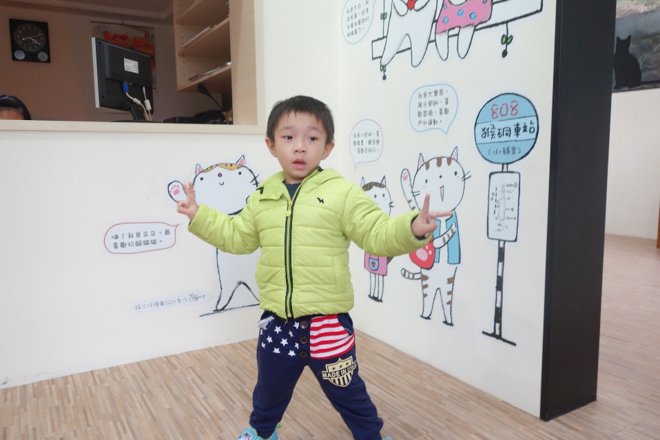 騏哥平常沒有表現很愛貓的樣子,但到這裡也失心瘋了,跟我說:媽媽,我好喜歡喵喵哦!